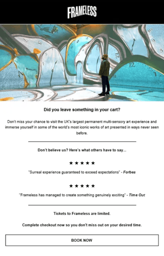 Cart Abandonment provides you with the ability to email those who have dropped off the purchase journey to encourage them to complete their purchase. TickX cart abandonment is set-up to trigger emails through an API connection to your CRM platform, meaning we handle the automatic triggers but you retain control of the look and feel of your emails.