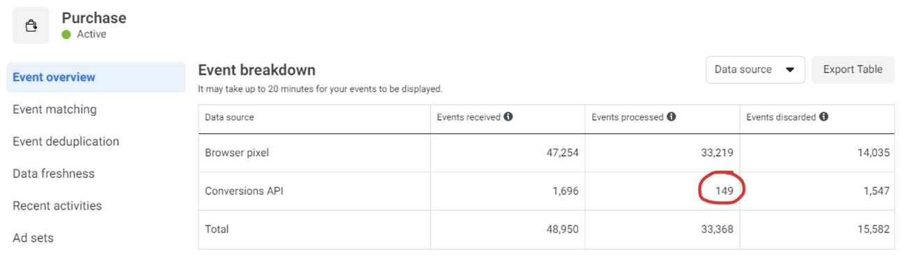 The number highlighted in red is the Purchase events that would have been missed without the Conversions API being installed.