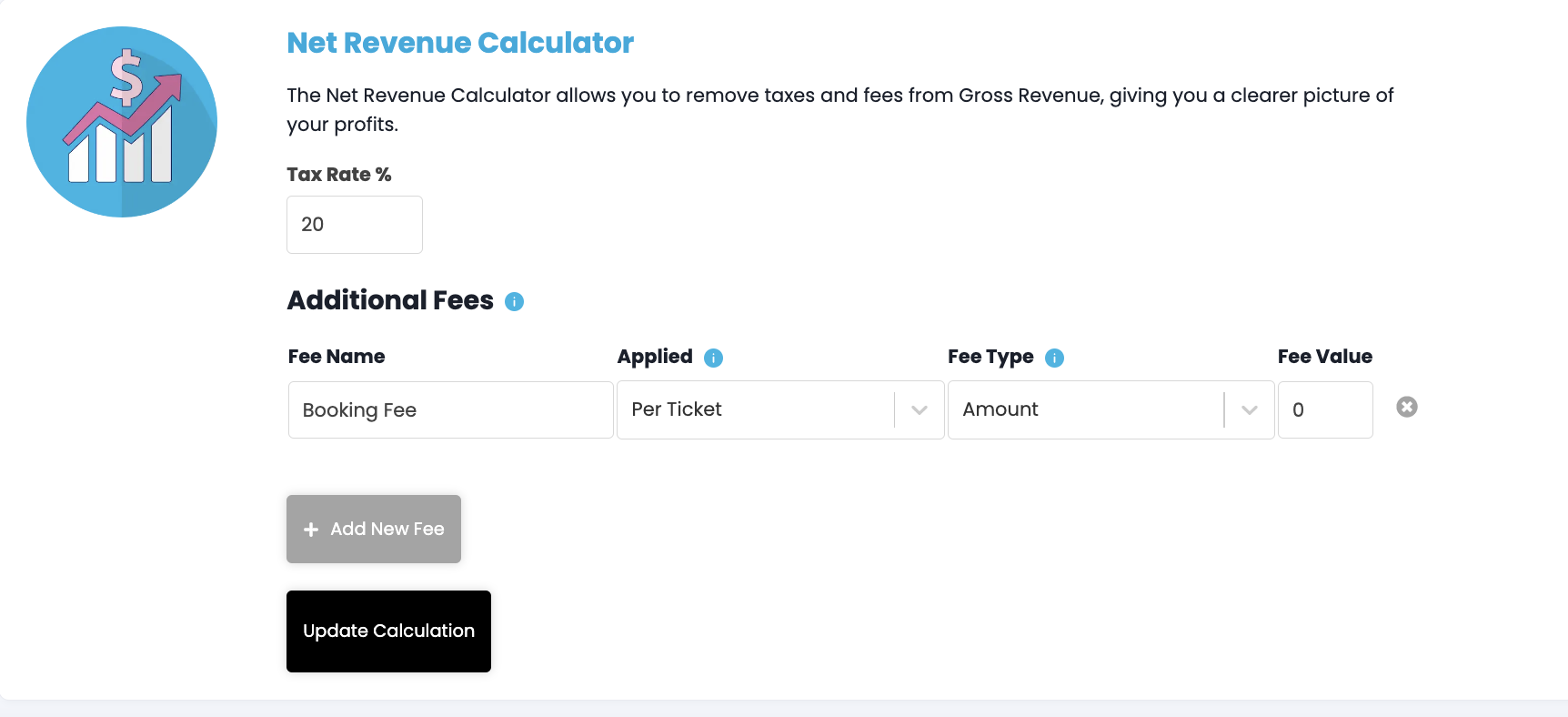 On the page you’ll find the ‘Net Revenue Calculator’. You can set up your Tax Rate by entering the % of tax in the box and additional fees such as commissions and booking fees using the ‘Add New Fee’ button