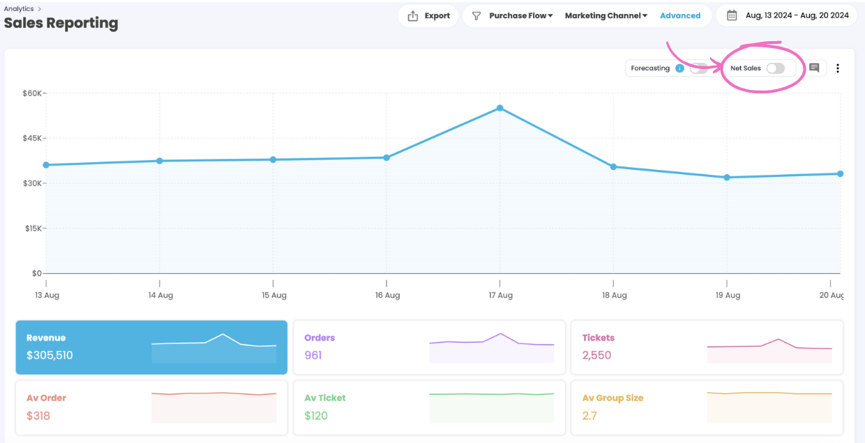 From your Sales Reporting dashboard under ‘Analytics’ in the navigation menu, you’ll see the ‘Net Sales’ toggle.