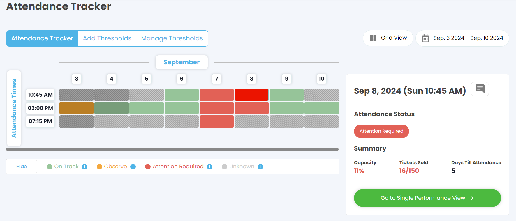 The Performance/Attendance Tracker allows you to view each timeslot's performance, set custom thresholds to determine when attention is required, and access a detailed Single Performance View. This functionality helps you make data-driven decisions to maximise attendance and revenue.