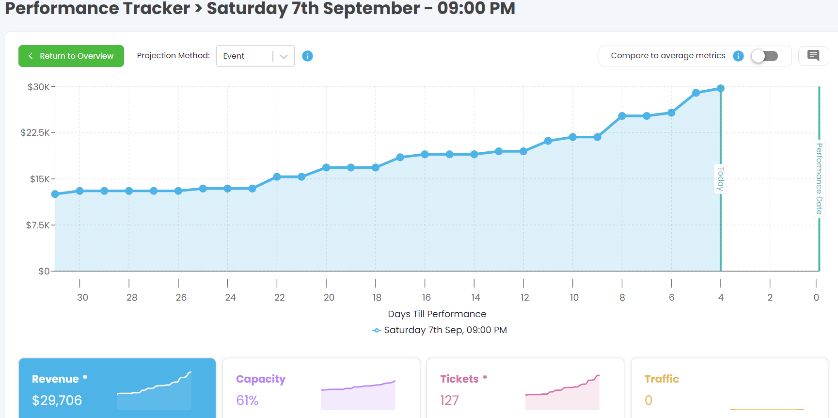 - Clicking on a specific timeslot in the grid takes you to the Single Performance View. This view provides a detailed analysis of sales trends leading up to the performance, including: