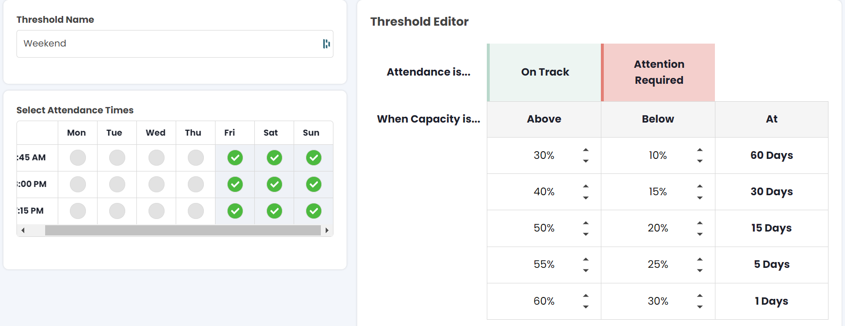 - Click on the Add Thresholds or Manage Thresholds tabs to customise thresholds according to your business needs. Adjust thresholds based on historical performance, expected demand, or other criteria to stay proactive in managing attendance.