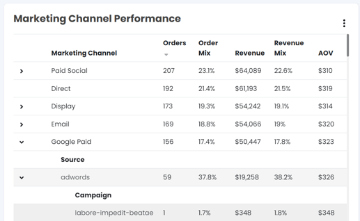 Examine the performance of specific sources and campaigns to understand which are most effective. For example, you might find that a particular campaign under the "Paid Social" channel is generating a high revenue but has a low order volume, indicating high-value purchases from a smaller customer base.