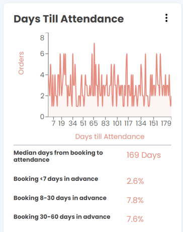 The "Days Till Attendance" section provides insights into booking behaviour by showing the number of days between when a booking is made and the actual attendance date. The data is presented in two formats:
