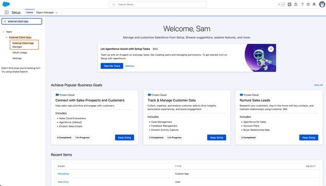 Step Two: Search in the Quick Find box in the top left for External Client App Manager and select the External Client App Manager option under Apps; External Client Apps
