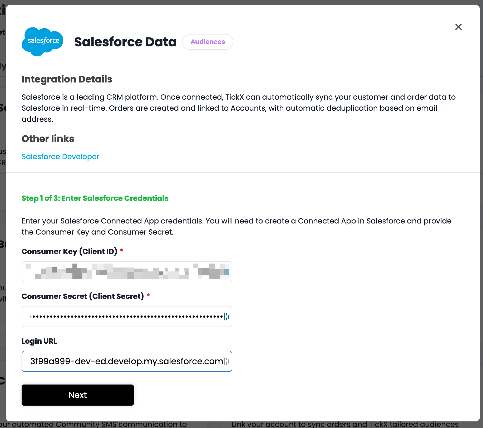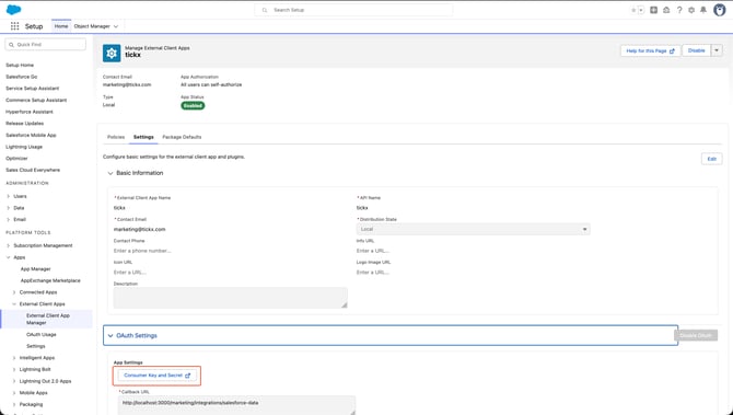 This is your TickX IQ URL that you use to log into TickX with the following /marketing/integrations/salesforce-data added. For example if your log-in to TickX IQ is on https://my.tickx.com then in this field you will enter ***https://my.tickx.com/marketing/integrations/salesforce-data***