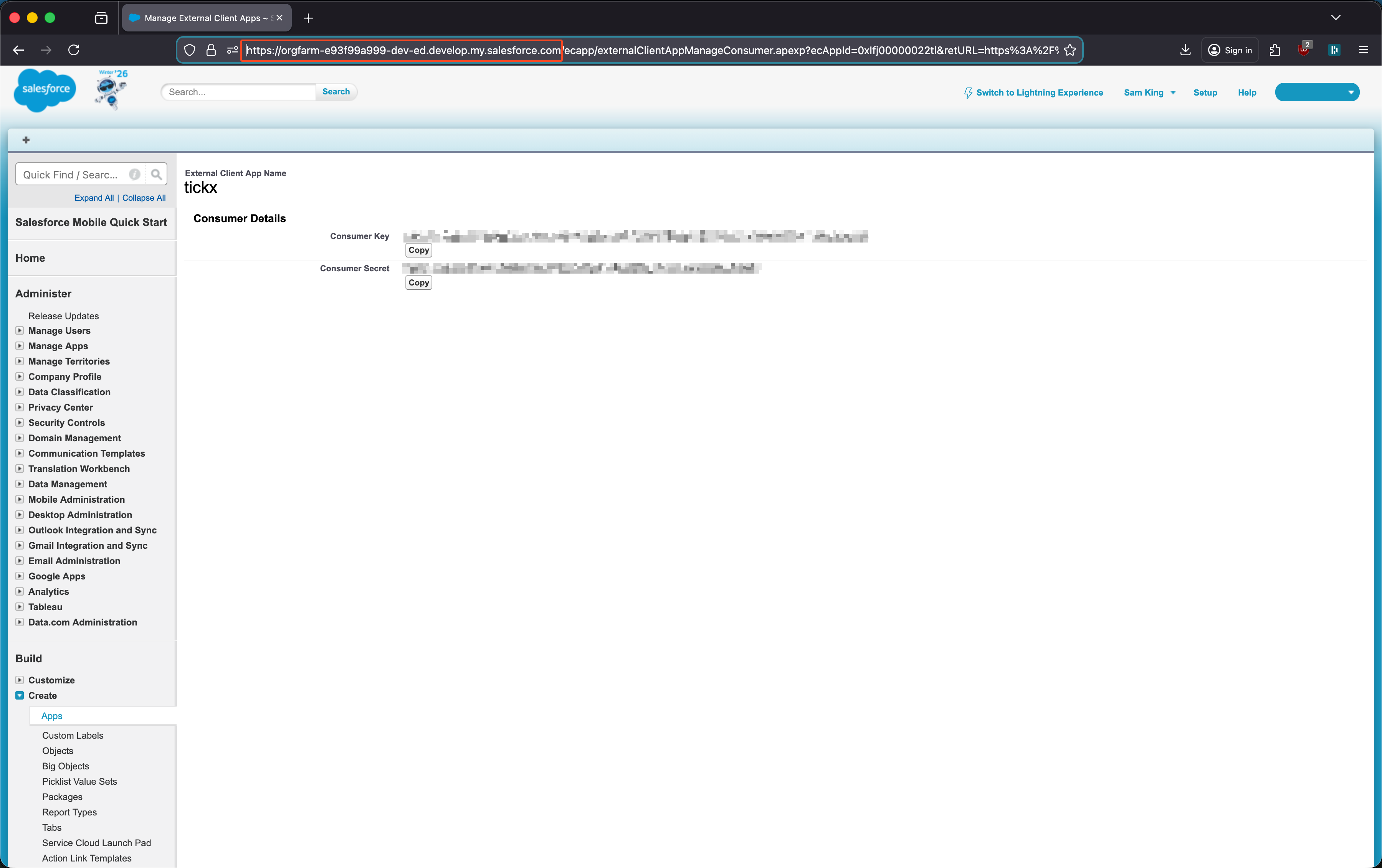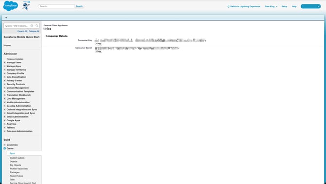 Please Note: When configuring inside of TickX If you are not using a standard Salesforce instance or authentication fails; the log-in URL is adjustable. To make this change, go to the page with your consumer key/secret on it and copy the URL from the browser at the top. Remove anything after the .com and paste in the Login URL field inside of TickX. See the image below for an example of the text which should be selected, in this example it should be https://orgfarm-e93f99a999-dev-ed.develop.my.salesforce.com