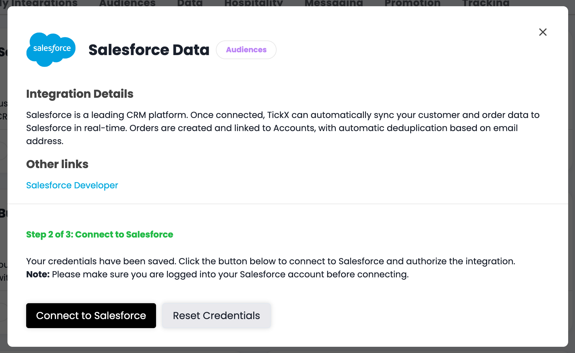 Step Ten: Click Connect to Salesforce button and follow the steps on screen to authenticate TickX.
