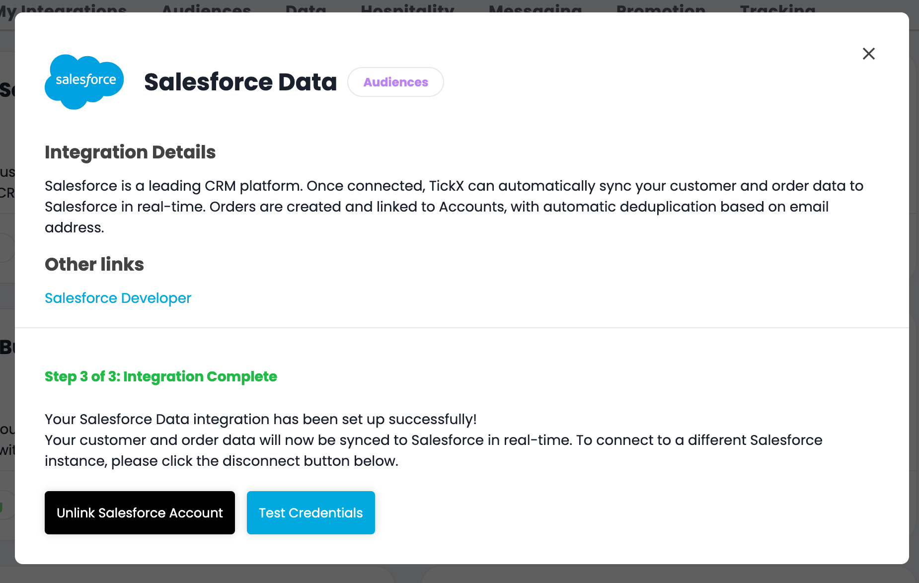 Your Salesforce Data integration is now configured, if you experience any problems with data syncs then use the Test Credentials button to ensure the connection is still valid. Un-link & Re-link if the credentials gives back any error messages.