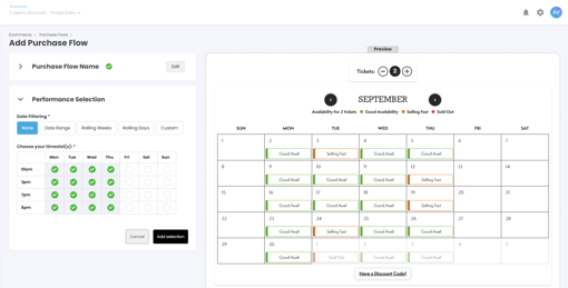 - Select which performances / timeslots you would like to be included within your purchase flow. E.g. Only Mid-Week