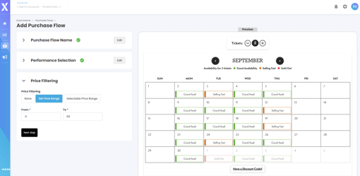 - Select the pricing parameters you would like to include within your purchase flow. E.g. Only include tickets priced under £60