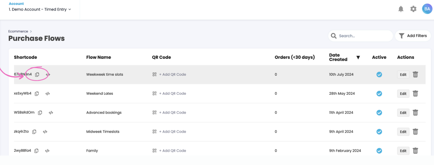 (For example: www.demoproduction.com/tickets/?flow=8WtncBiC) - You will be able to check this is working as it will automatically pull through the criteria set in the purchase flow.