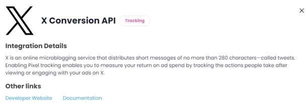 Tracking uses the X Conversions API to allow TickX to send order confirmations directly to X, which can be used in the same way as standard tracking events, but without any cross channel tracking challenges or cookie blockers.